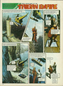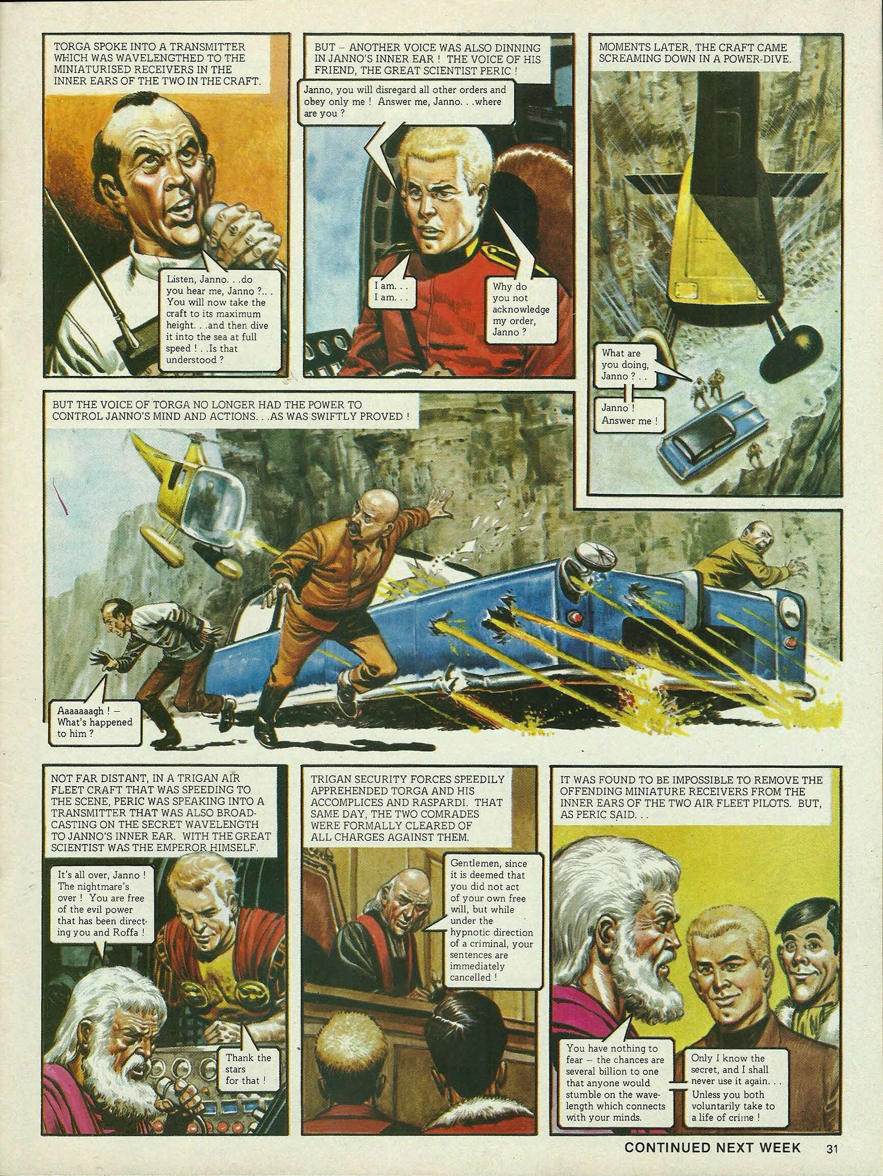 Posted on October 11, 2025October 14, 2025The Mind Controller (continued . . .) As the smoke of the exploding anti-aircraft battery cleared away, the alien craft came low. Ready for the lift-off ! All three convicts were lifted from the top of the black tower. They were helped aboard the craft, and Raspardi was greeted by none other than. . . the physician Torga. So ! It is to you that I am indebted for this rescue ? It is indeed, my friend — and it will cost you half of the stolen moneys which you have got hidden away ! A fast automobile waited on a lonely road on the mainland. What now, Torga ? Now, Raspardi, we drive to a hide-out where you will remain till you have paid over the money. As for our friends Janno and Roffa . . . Janno and Roffa remained on the craft when the others had left it. At a curt order from Torga, Janno piloted it skywards again. Where are they going ? They, my friend, are going to destruction ! You mean ? . . Their task is finished. I now propose to wipe out the living evidence of our little conspiracy . . . Or, more correctly, order them to wipe out themselves ! Torga spoke into a transmitter which was wavelengthed to the miniaturised receivers in the inner ears of the two in the craft. Listen, Janno . . . do you hear me, Janno ? . . . You will now take the craft to its maximum height . . . and then dive it into the sea at full speed ! . . Is that understood ? But—another voice was also dinning in Janno’s inner ear ! The voice of his friend, the great scientist Peric ! Janno, you will disregard all other orders and obey only me ! Answer me, Janno . . . where are you ? I am . . . I am . . . Why do you not acknowledge my order, Janno ? Moments later, the craft came screaming down in a power-dive. What are you doing, Janno ? . . Janno ! Answer me ! But the voice of Torga no longer had the power to control Janno’s mind and actions . . . as was swiftly proved ! Aaaaaaagh !— What’s happened to him ? Not far distant, in a Trigan Air Fleet craft that was speeding to the scene, Peric was speaking into a transmitter that was also broadcasting on the secret wavelength to Janno’s inner ear. With the great scientist was the Emperor himself. It’s all over, Janno ! The nightmare’s over ! You are free of the evil power that has been direct- ing you and Roffa ! Thank the stars for that ! Trigan security forces speedily apprehended Torga and his accomplices and Raspardi. That same day, the two comrades were formally cleared of all charges against them. Gentlemen, since it is deemed that you did not act of your own free will, but while under the hypnotic direction of a criminal, your sentences are immediately cancelled ! It was found to be impossible to remove the offending miniature receivers from the inner ears of the two Air Fleet pilots. But, as Peric said . . . You have nothing to fear—the chances are several billion to one that anyone would stumble on the wave- length which connects with your minds. Only I know the secret, and I shall never use it again . . . Unless you both voluntarily take to a life of crime ! This instalment was originally published in Look and Learn issue no. 717 on 11 October 1975.