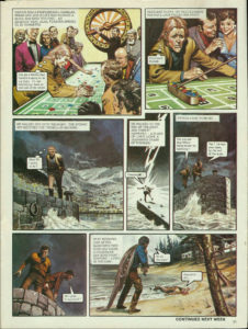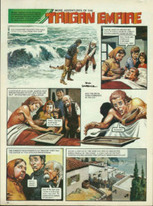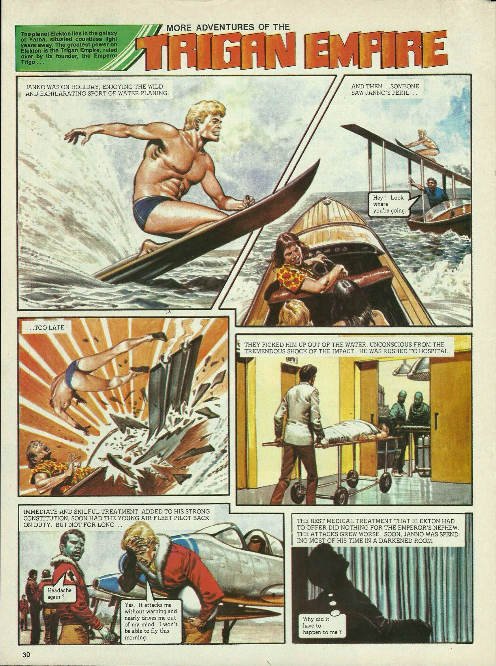 Posted on October 18, 2025October 28, 2025The Faith Healer Janno was on holiday, enjoying the wild and exhilarating sport of water-planing. And then . . . someone saw Janno’s peril . . . Hey ! Look where you’re going. . . . Too late ! They picked him up out of the water, unconscious from the tremendous shock of the impact. He was rushed to hospital. Immediate and skilful treatment, added to his strong constitution, soon had the young air fleet pilot back on duty. But not for long . . . Headache again ? Yes. It attacks me without warning and nearly drives me out of my mind. I won’t be able to fly this morning. The best medical treatment that Elekton had to offer did nothing for the Emperor’s nephew. The attacks grew worse. Soon, Janno was spending most of his time in a darkened room. Why did it have to happen to me ? Your browser does not support the video tag. Your browser does not support the video tag. Your browser does not support the video tag. Nastor was a professional gambler, whose one aim in life was to make a quick and easy fortune. An ambition that, alas, forever seemed to be thwarted. I’ve got a feeling that tonight is going to be my night. I’ll risk everything I have on one spin of the wheel. Needless to say, on this occasion, Nastor’s luck failed him again. I’m ruined. Ruined. He walked out into the night. The stormy sky matched the turmoil in his mind. What am I going to do ? He walked to the end of the quay. And then it happened —a flash of lurid light, a deafening crash of thunder. Eaaaaaaghh ! Others came running . . . Did you see that fellow being struck by lightning ? Yes ! He was over there, by the end of the quay. He’s gone . . . disappeared ! Next morning, just after Elekton’s twin suns had risen, a fisherman saw something—someone —lying in the surf. By all the stars ! Aaaaahhh . . . ahh . . . This instalment was originally published in Look and Learn issue no. 718 on 18 October 1975.