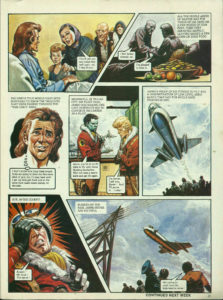 Posted on October 25, 2025October 28, 2025The Faith Healer (continued . . .) The fishermen dragged the half- conscious form from the surf. Later, Nastor opened his eyes to find a row of honest faces looking down on him. Here, friend, take a little gruel. It will make you strong again. A couple of days later, Nastor felt strong enough to try and feed himself. He reached out for a spoon . . . There ! See how much better you are, friend. And the spoon hung suspended in the air ! Aaaaaaaah ! The superstitious fisher-folk thought they had the answer to this strange phenomenon. He is a miracle- worker ! One of the wise ones ! I knew of such a one when I was a lad. He could cure all manner of sicknesses ! Within a few days, the news had spread among the simple people of the coast. A long line of patient figures queued outside the cottage where Nastor lay. Touch my son and make him well again, sir. I beg of you. All the people asked of Nastor was the touch of his hand or a few words of comfort, then they departed happily, leaving behind a few coins or some food. I feel better already, sir. I’m pleased to hear it. The simple folk would have been surprised to know the thoughts that were passing through the “wise one’s” mind. I don’t know how long these stupid fools are going to treat me like some kind of god, but I’ll stay here until I get my strength back and at the same time make some money on the side. Meanwhile, in Trigan City Air Fleet base, Janno was making one last desperate bid to continue his career as a pilot. Janno, you’re in no fit state to fly with those blinding headaches. Why not take a year’s leave and get fit again. I’m better, I tell you, Keren ! And I’ll prove it . . . today ! Janno’s proof of his fitness to fly was a demonstration of low-level aerobatics that had the whole base staring in awe. But, in the cockpit . . . Aaaaah ! My head ! The agony ! Blinded by the pain, Janno never saw his peril . . . He’s going to crash into the high-tension wires ! This instalment was originally published in Look and Learn issue no. 719 on 25 October 1975.