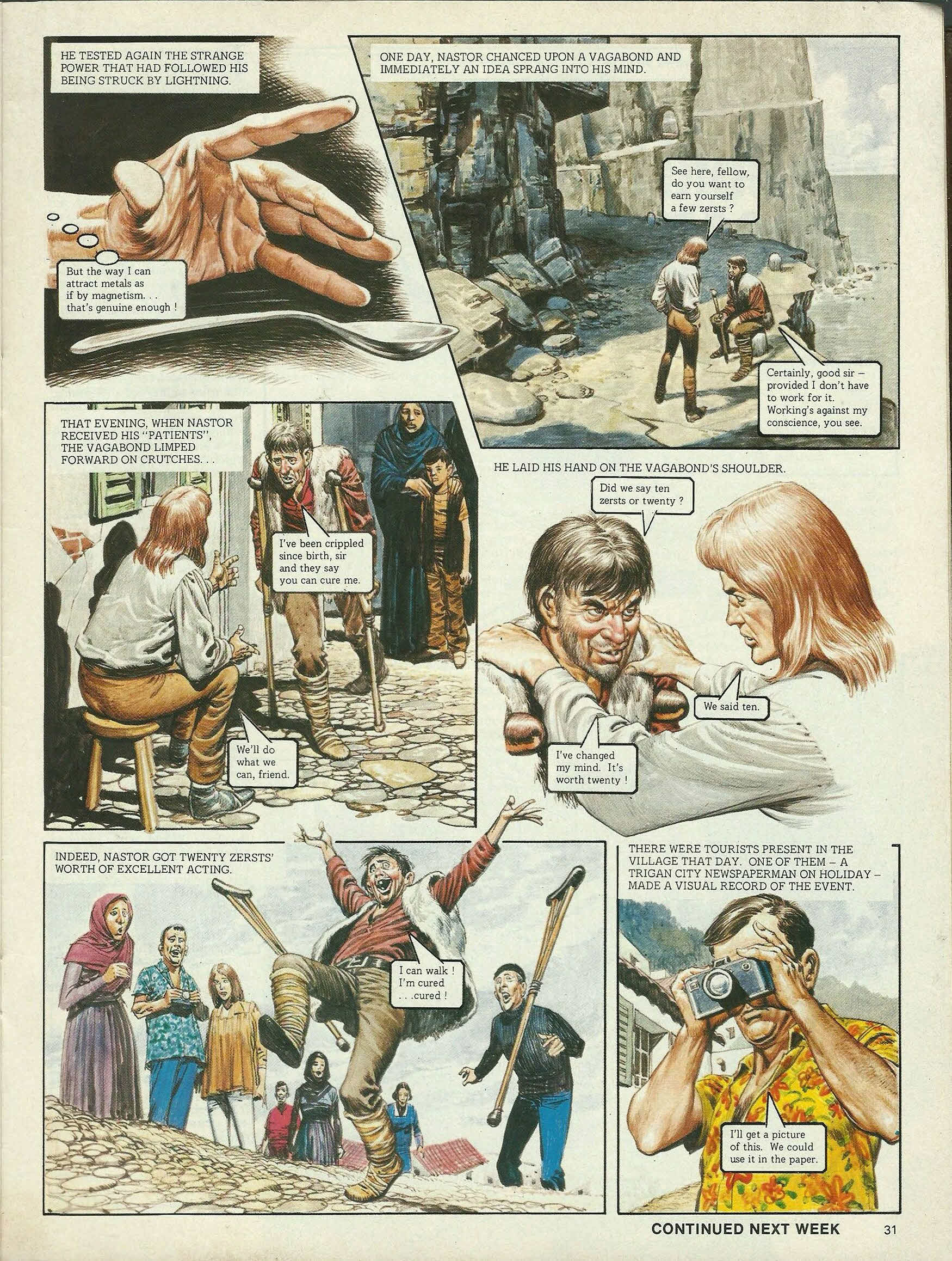 He tested again the strange power that had followed his being struck by lightning. But the way I can attract metals as if by magnetism . . . that’s genuine enough ! One day, Nastor chanced upon a vagabond and immediately an idea sprang into his mind. See here, fellow, do you want to earn yourself a few zersts ? Certainly, good sir— provided I don’t have to work for it. Working’s against my conscience, you see. That evening, when Nastor received his “patients”, the vagabond limped forward on crutches . . . I’ve been crippled since birth, sir, and they say you can cure me. We’ll do what we can, friend. He laid his hand on the vagabond’s shoulder. Did we say ten zersts or twenty ? We said ten. I’ve changed my mind. It’s worth twenty ! Indeed, Nastor got twenty zersts’ worth of excellent acting. I can walk ! I’m cured . . . cured ! There were tourists present in the village that day. One of them—a Trigan City newspaperman on holiday—made a visual record of the event. I’ll get a picture of this. We could use it in the paper.