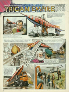 All Elekton was tuned-in to one of the outstanding events of the age. We see Keren of the Air Fleet about to climb into the cockpit of what may prove to be the fastest craft that will ever fly in the atmosphere. Janno, the Emperor’s nephew, shook hands with his comrade. Janno was training for the forthcoming Trigan Empire Games, otherwise he would have been piloting “the Ultimate Aircraft”. I still feel as if I’ve stolen your place, Janno. Nonsense, Keren. You deserve to be the fastest pilot ever. Good luck to you. Keren made a circuit of the entire planet in one-sixteenth of the time it had ever been done before. In passing, the plane’s ultra-sonic boom caused extensive damage. The old tower’s going to fall ! Peric, Elekton’s top scientist, who had designed “the Ultimate Aircraft”, was furious—with himself. All right, say what you’re thinking. It’s too fast to be of any military use and too small to carry passengers. It’s an amusing toy, fit only for a museum ! The craft, destined to be stripped down to its component parts for close examination in Peric’s laboratory, was loaded on to a transporter and taken away from the air base. Some distance down the highway . . . Halt !