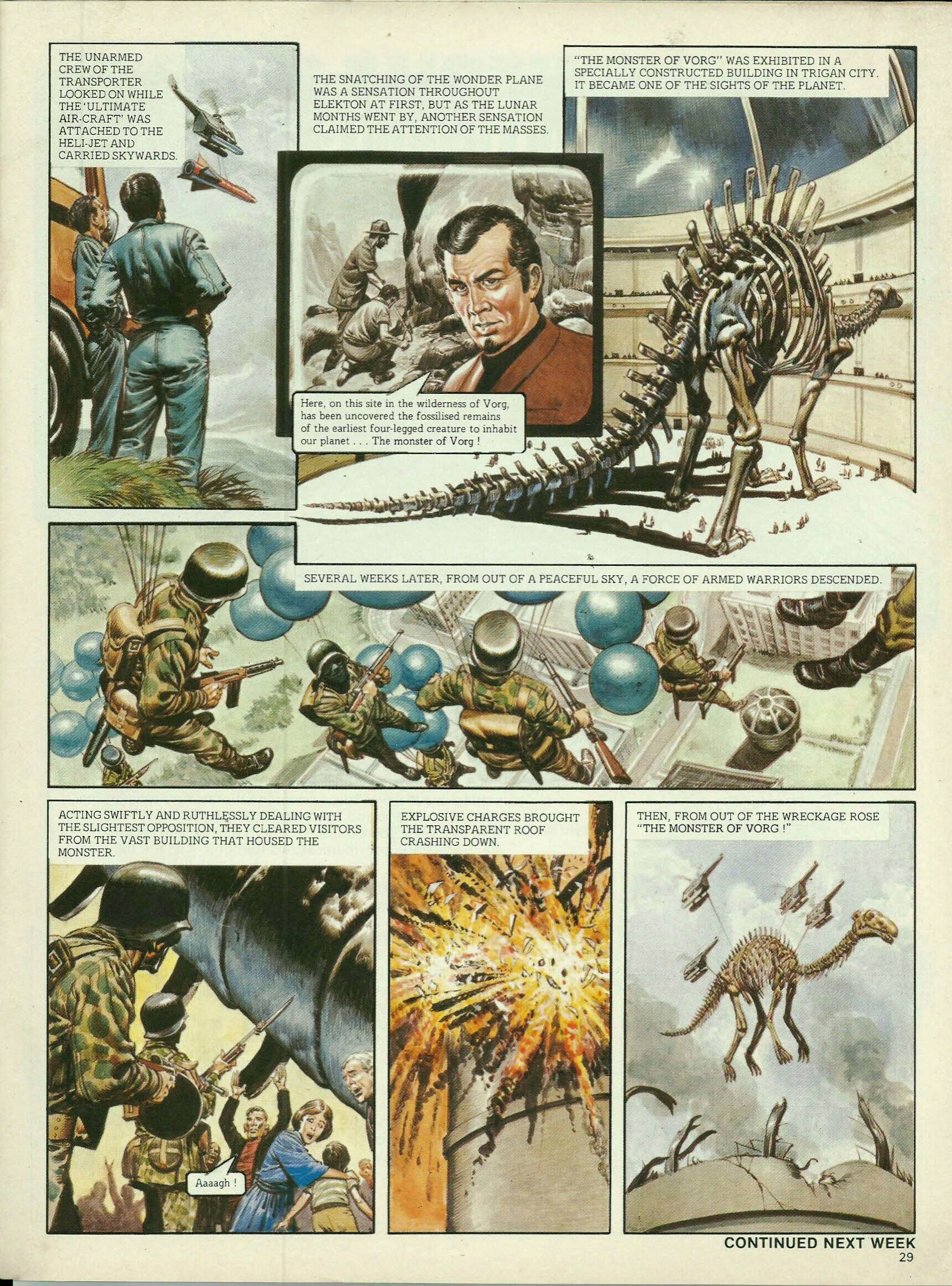 The unarmed crew of the transporter looked on while “the Ultimate Aircraft” was attached to the heli-jet and carried skywards. The snatching of the wonder plane was a sensation throughout Elekton at first, but as the lunar months went by, another sensation claimed the attention of the masses. Here, on this site in the wilderness of Vorg, has been uncovered the fossilised remains of the earliest four-legged creature to inhabit our planet . . . the Monster of Vorg ! “The Monster of Vorg” was exhibited in a specially constructed building in Trigan City. It became one of the sights of the planet. Several weeks later, from out of a peaceful sky, a force of armed warriors descended. Acting swiftly and ruthlessly dealing with the slightest opposition, they cleared visitors from the vast building that housed the monster. Aaaagh ! Explosive charges brought the transparent roof crashing down. Then, from out of the wreckage rose “the Monster of Vorg” !