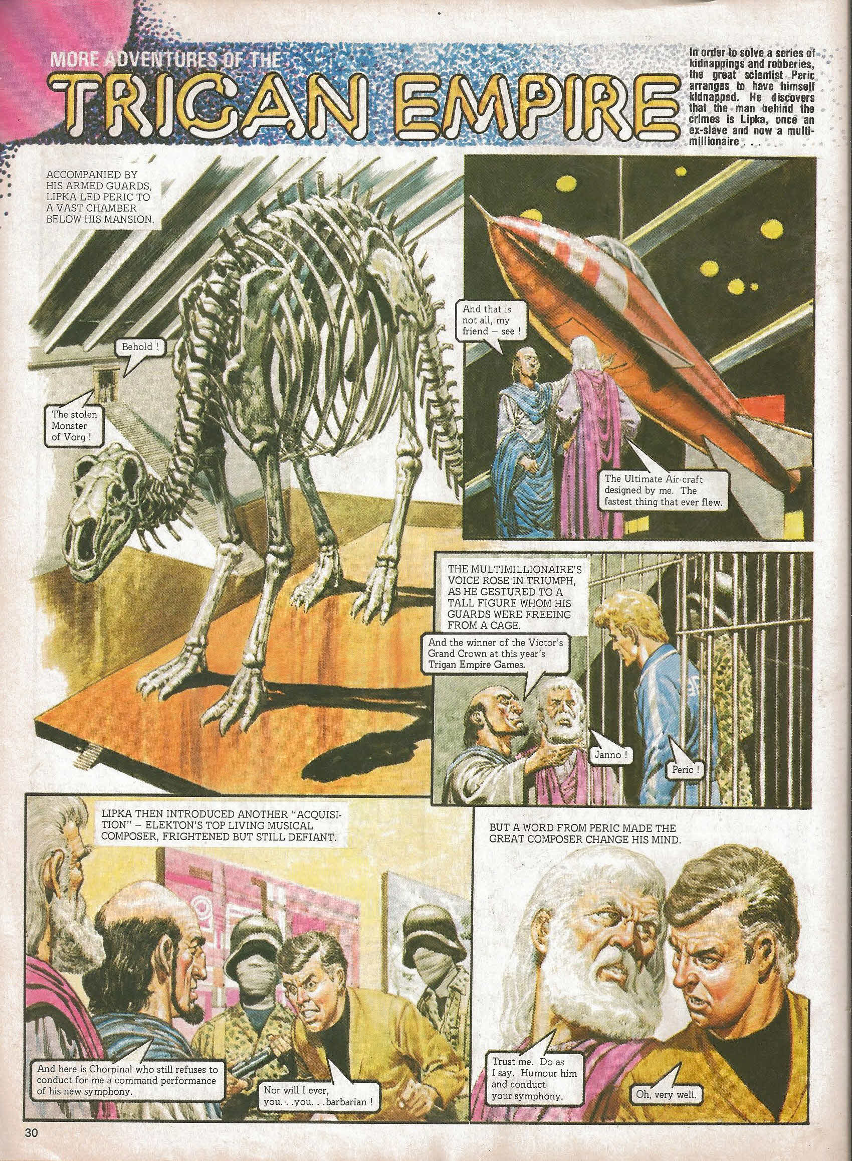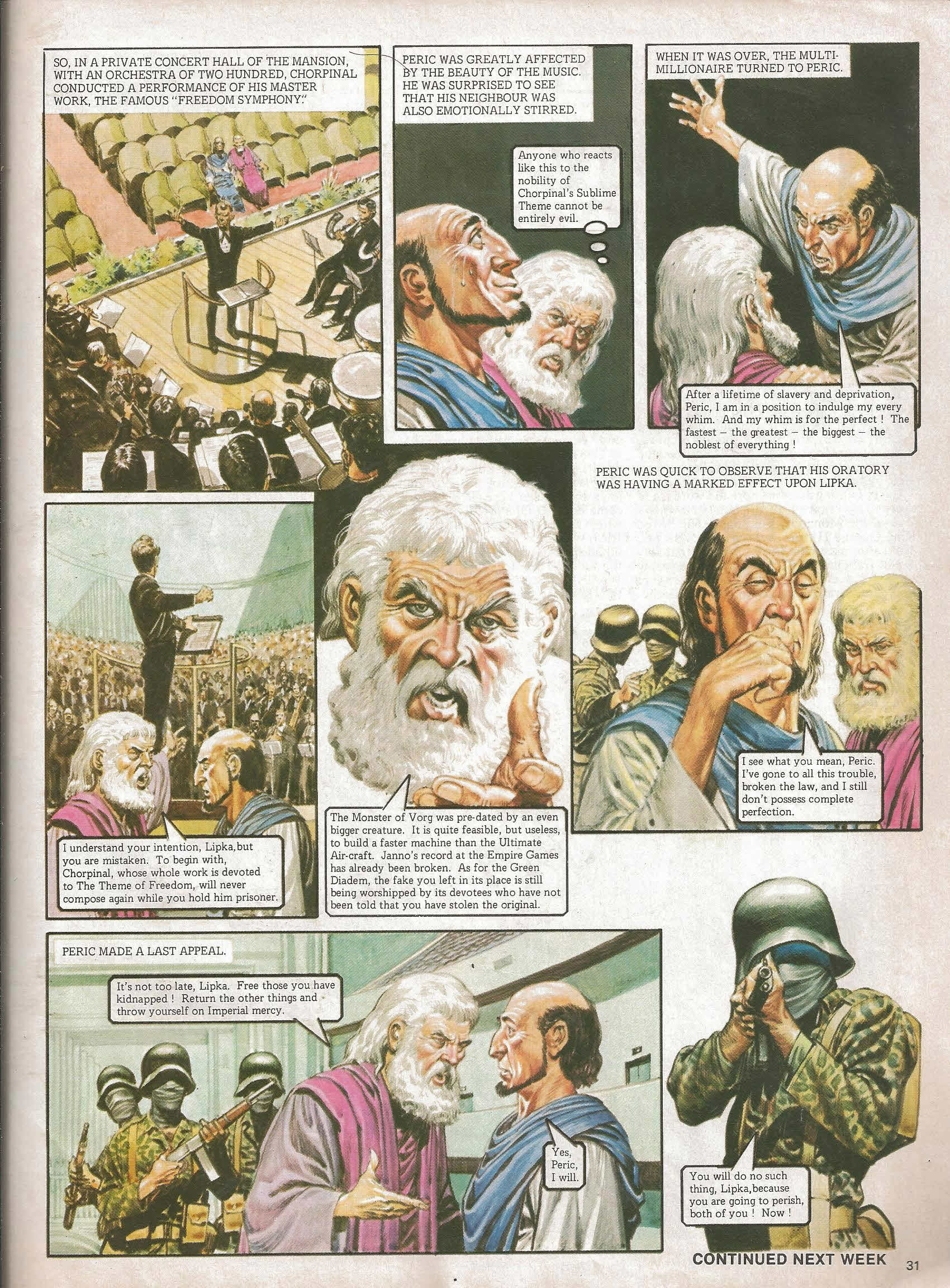 Accompanied by his armed guards, Lipka led Peric to a vast chamber below his mansion. Behold! The stolen Monster of Vorg! And that is not all, my friend—see! The Ultimate Aircraft designed by me. The fastest thing that ever flew. The multimillionaire’s voice rose in triumph, as he gestured to a tall figure whom his guards were freeing from a cage. And the winner of the Victor’s Grand Crown at this year’s Trigan Empire Games. Janno! Peric! Lipka then introduced another “acquisition”—Elekton’s top living musical composer, frightened but still defiant. And here is Chorpinal who still refuses to conduct for me a command performance of his new symphony. Nor will I ever, you . . . you . . . barbarian! But a word from Peric made the great composer change his mind. Trust me. Do as I say. Humour him and conduct your symphony. Oh, very well.So, in a private concert hall of the mansion, with an orchestra of two hundred, Chorpinal conducted a performance of his master work, the famous “Freedom Symphony”. Peric was greatly affected by the beauty of the music. He was surprised to see that his neighbour was also emotionally stirred. Anyone who reacts like this to the nobility of Chorpinal’s sublime theme cannot be entirely evil. When it was over, the multimillionaire turned to Peric. After a lifetime of slavery and deprivation, Peric, I am in a position to indulge my every whim. And my whim is for the perfect! The fastest—the greatest—the biggest—the noblest of everything! I understand your intention, Lipka, but you are mistaken. To begin with, Chorpinal, whose whole work is devoted to the theme of freedom, will never compose again while you hold him prisoner. The Monster of Vorg was pre-dated by an even bigger creature. It is quite feasible, but useless, to build a faster machine than the Ultimate Aircraft. Janno’s record at the Empire Games has already been broken. As for the Green Diadem, the fake you left in its place is still being worshipped by its devotees who have not been told that you have stolen the original. Peric was quick to observe that his oratory was having a marked effect upon Lipka. I see what you mean, Peric. I’ve gone to all this trouble, broken the law, and I still don’t possess complete perfection. Peric made a last appeal. It’s not too late, Lipka. Free those you have kidnapped! Return the other things and throw yourself on Imperial mercy. Yes, Peric, I will. You will do no such thing, Lipka, because you are going to perish, both of you! Now!