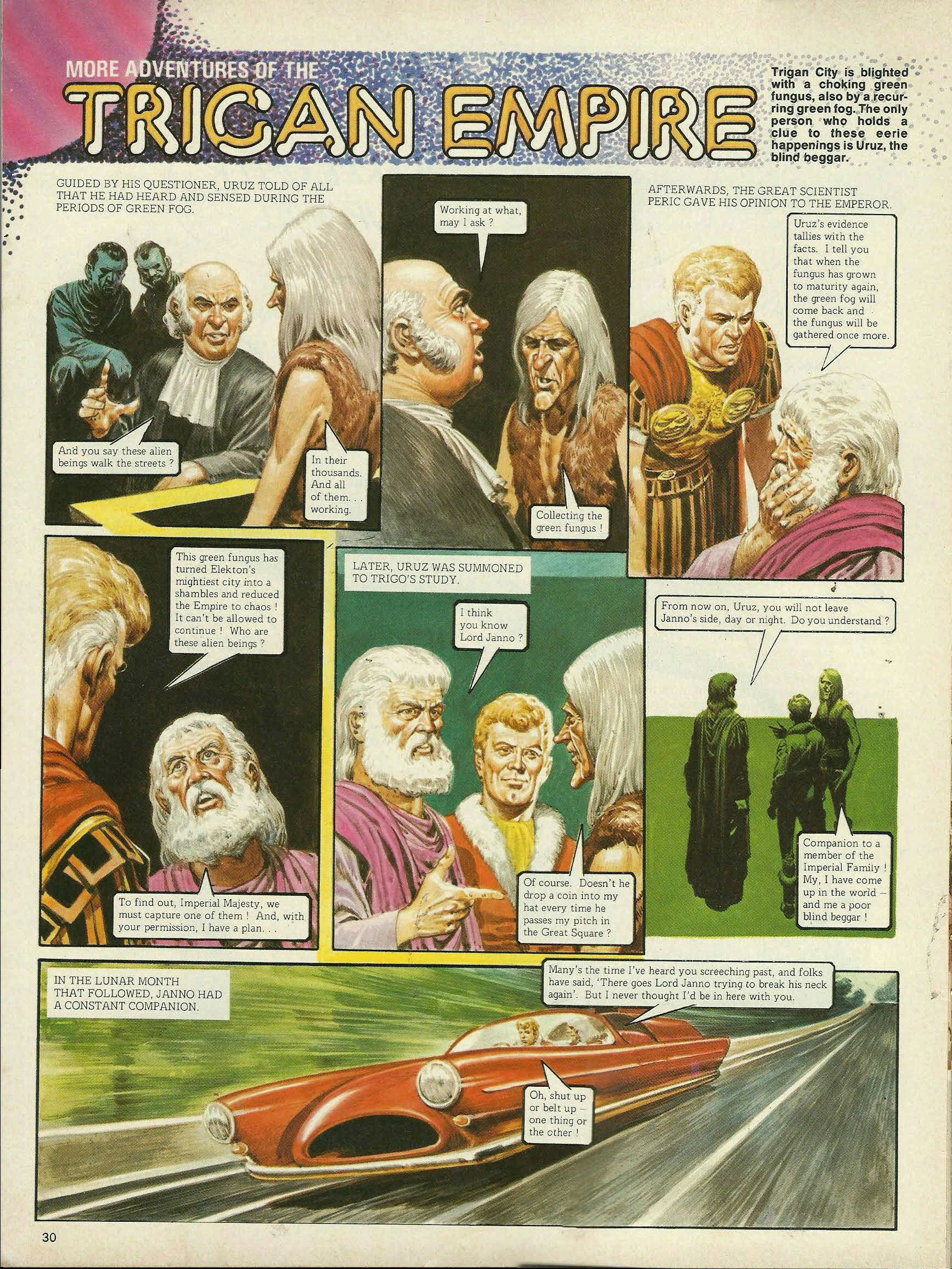 Guided by his questioner, Uruz told of all that he had heard and sensed during the periods of green fog. And you say these alien beings walk the streets? In their thousands. And all of them . . . working. Working at what, may I ask? Collecting the green fungus! Afterwards, the great scientist Peric gave his opinion to the Emperor. Uruz’s evidence tallies with the facts. I tell you that when the fungus has grown to maturity again, the green fog will come back and the fungus will be gathered once more. This green fungus has turned Elekton’s mightiest city into a shambles and reduced the empire to chaos! It can’t be allowed to continue! Who are these alien beings? To find out, Imperial Majesty, we must capture one of them! And, with your permission, I have a plan. . . Later, Uruz was summoned to Trigo’s study. I think you know Lord Janno? Of course. Doesn’t he drop a coin into my hat every time he passes my pitch in the Great Square? From now on, Uruz, you will not leave Janno’s side, day or night. Do you understand? Companion to a member of the Imperial Family! My, I have come up in the world—and me a poor blind beggar! In the lunar month that followed, Janno had a constant companion. Many’s the time I’ve heard you screeching past, and folks have said, “there goes Lord Janno trying to break his neck again”. But I never thought I’d be in here with you. Oh, shut up or belt up — one thing or the other!As Peric had predicted, the fungus multiplied until it had become almost a familiar sight. You certainly know how to enjoy life, Uruz. It’s bad enough being blind and poor, sir. There’s no point in being miserable as well. Mind you, this is a great improvement on begging for coins in the Great Square! One fateful morning—it came! The green fog! It’s here again, Uruz! Remember! Don’t stray from my side! Tell me everything you sense or hear. And let me know as soon as one of those alien beings comes within reach. You can rely on me, sir. Slowly, inexorably, the almost abandoned city, heart of the Trigan empire, was swallowed up. The long day crept slowly past. Janno waited, every nerve stretched to snapping point. And then—it happened! One of them’s close to you! Yes! I’ve got him! Aaaaaaaeehh! When the fog cleared away, Janno and Uruz stepped out of their hiding place, and Janno looked down at his victim. By all the stars!