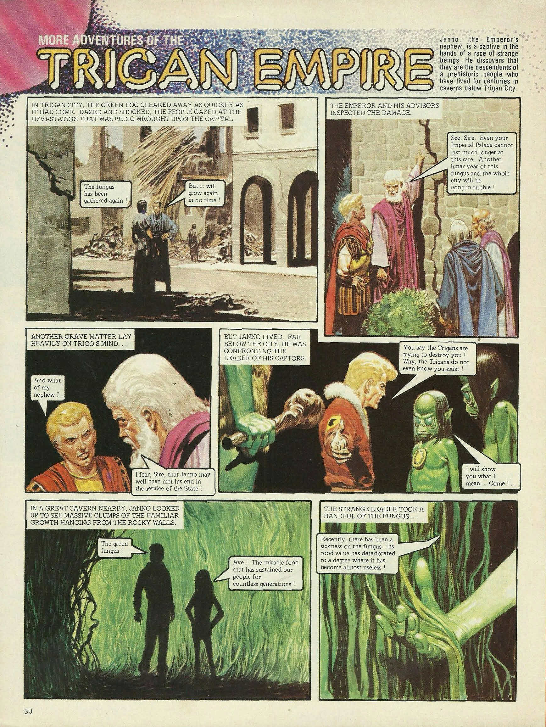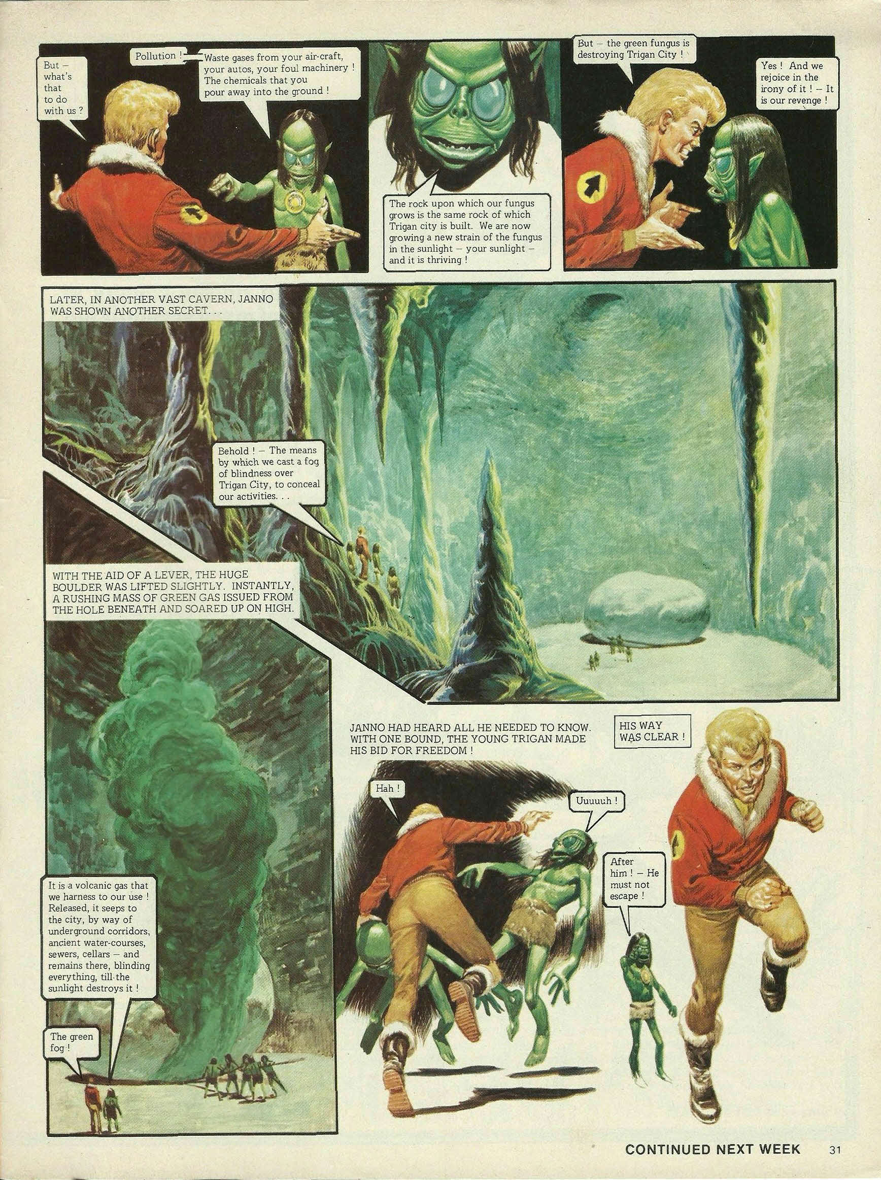 In Trigan City, the green fog cleared away as quickly as it had come. Dazed and shocked, the people gazed at the devastation that was being wrought upon the capital. The fungus has been gathered again! But it will grow again in no time! The Emperor and his advisors inspected the damage. See, Sire. Even your Imperial Palace cannot last much longer at this rate. Another lunar year of this fungus and the whole city will be lying in rubble! Another grave matter lay heavily on Trigo’s mind . . . And what of my nephew? I fear, Sire, that Janno may well have met his end in the service of the state! But Janno lived. Far below the city, he was confronting the leader of his captors. You say the Trigans are trying to destroy you! Why, the Trigans do not even know you exist! I will show you what I mean . . . come! . . In a great cavern nearby, Janno looked up to see massive clumps of the familiar growth hanging from the rocky walls. The green fungus! Aye! The miracle food that has sustained our people for countless generations! The strange leader took a handful of the fungus . . . Recently, there has been a sickness on the fungus. Its food value has deteriorated to a degree where it has become almost useless!But—what’s that to do with us? Pollution! Waste gases from your air-craft, your autos, your foul machinery! The chemicals that you pour away into the ground! The rock upon which our fungus grows is the same rock of which Trigan City is built. We are now growing a new strain of the fungus in the sunlight—your sunlight—and it is thriving! But—the green fungus is destroying Trigan City! Yes! And we rejoice in the irony of it!—It is our revenge! Later, in another vast cavern, Janno was shown another secret . . . Behold!—the means by which we cast a fog of blindness over Trigan City, to conceal our activities . . . With the aid of a lever, the huge boulder was lifted slightly. Instantly, a rushing mass of green gas issued from the hole beneath and soared up on high. It is a volcanic gas that we harness to our use! Released, it seeps to the city, by way of underground corridors, ancient water-courses, sewers, cellars—and remains there, blinding everything, till the sunlight destroys it! The green fog! Janno had heard all he needed to know. With one bound, the young Trigan made his bid for freedom! Hah! Uuuuuh! His way was clear! After him!—He must not escape!
